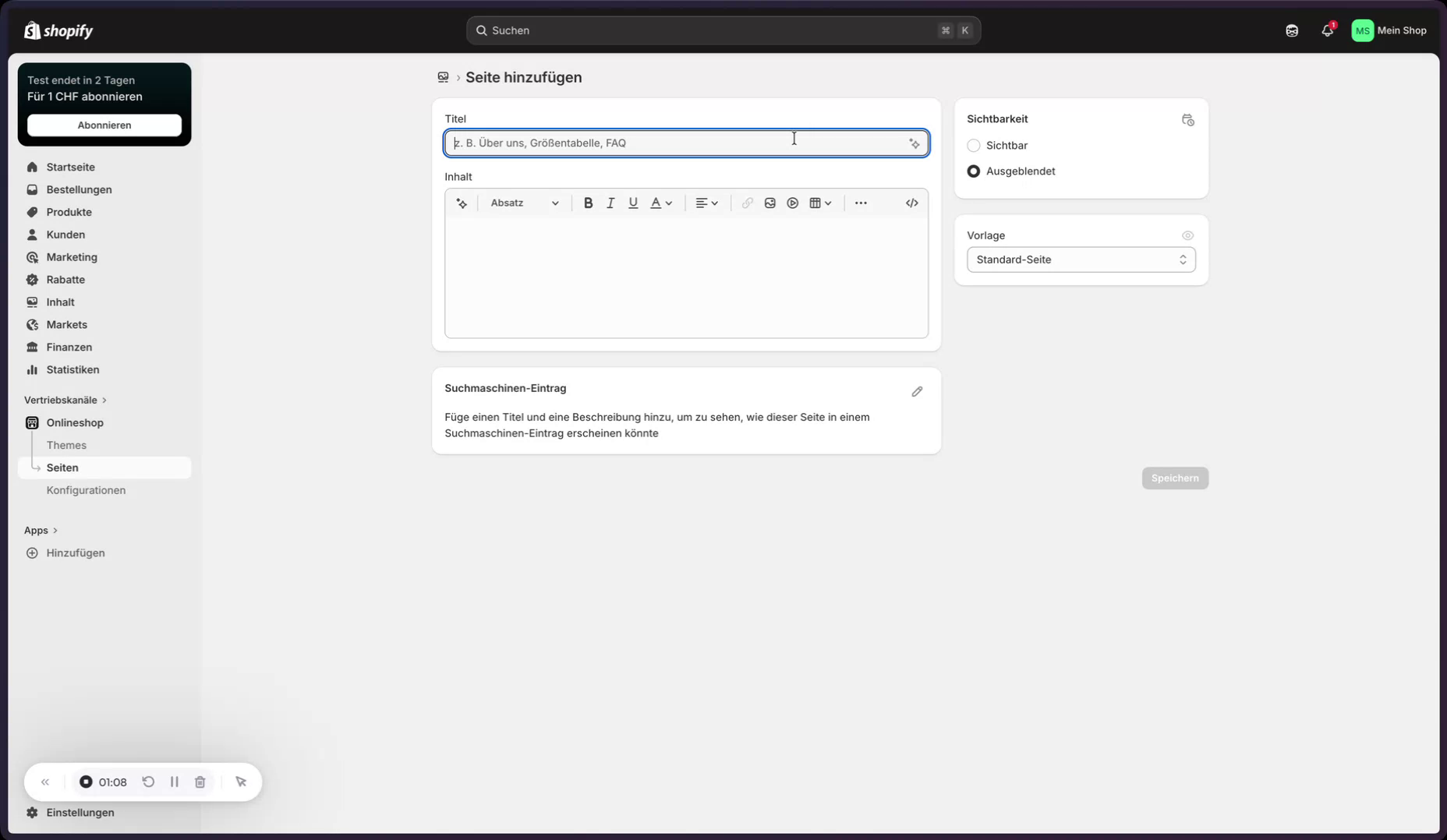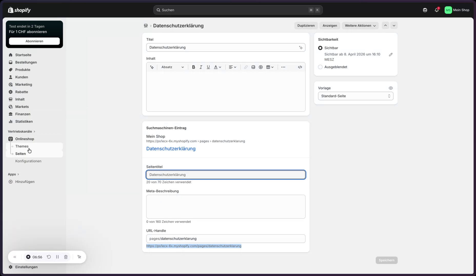 Dazu werden zwei neue Seiten im Shopify-Backend angelegt: eine Seite für die Datenschutzerklärung und eine Seite für das Impressum.