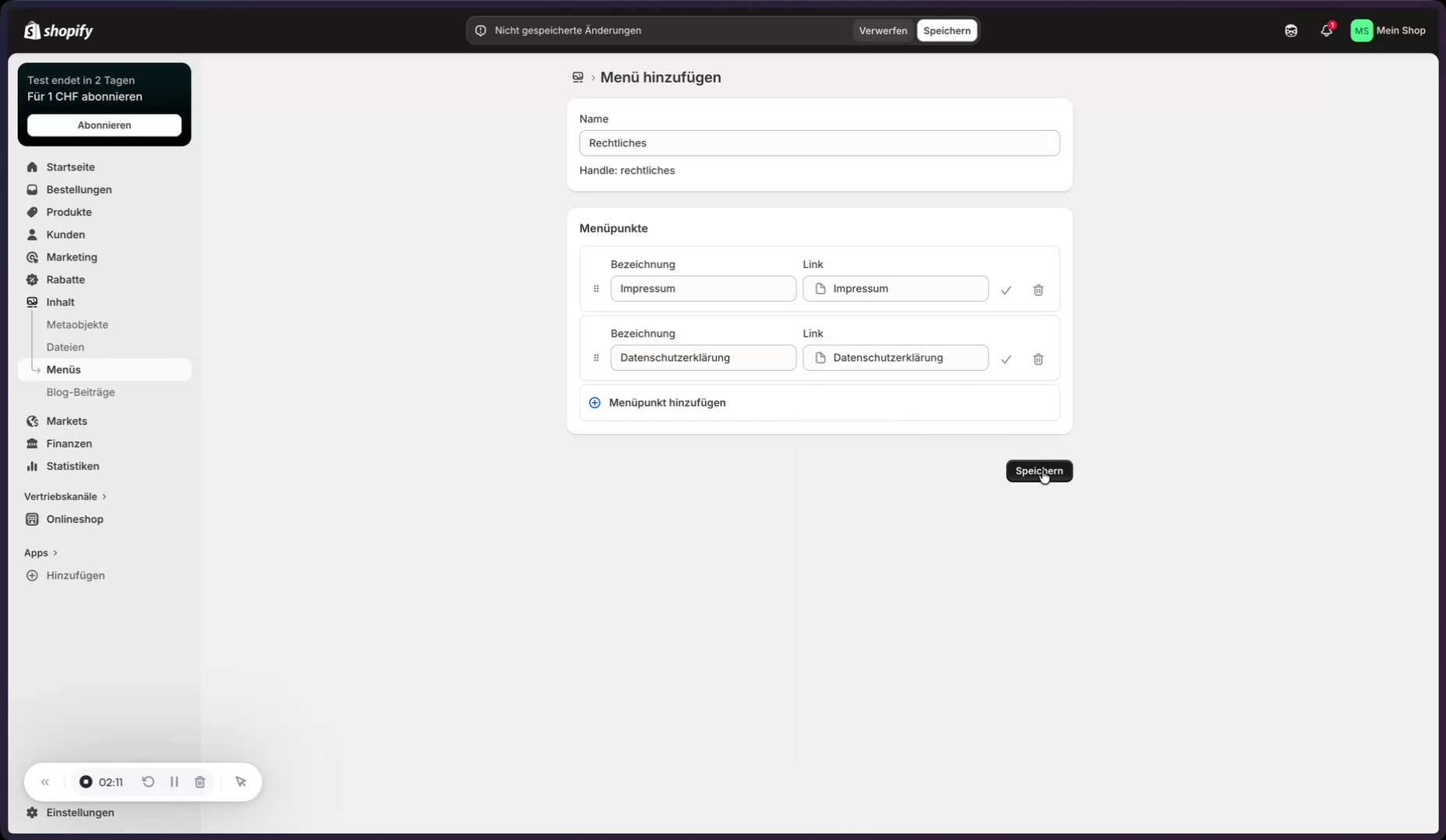 Im Bereich „Navigation“ von Shopify wird ein neues Menü mit dem Namen „Rechtliches“ angelegt. Anschließend werden die Seiten „Datenschutzerklärung“ und „Impressum“ als Menüpunkte hinzugefügt und gespeichert.