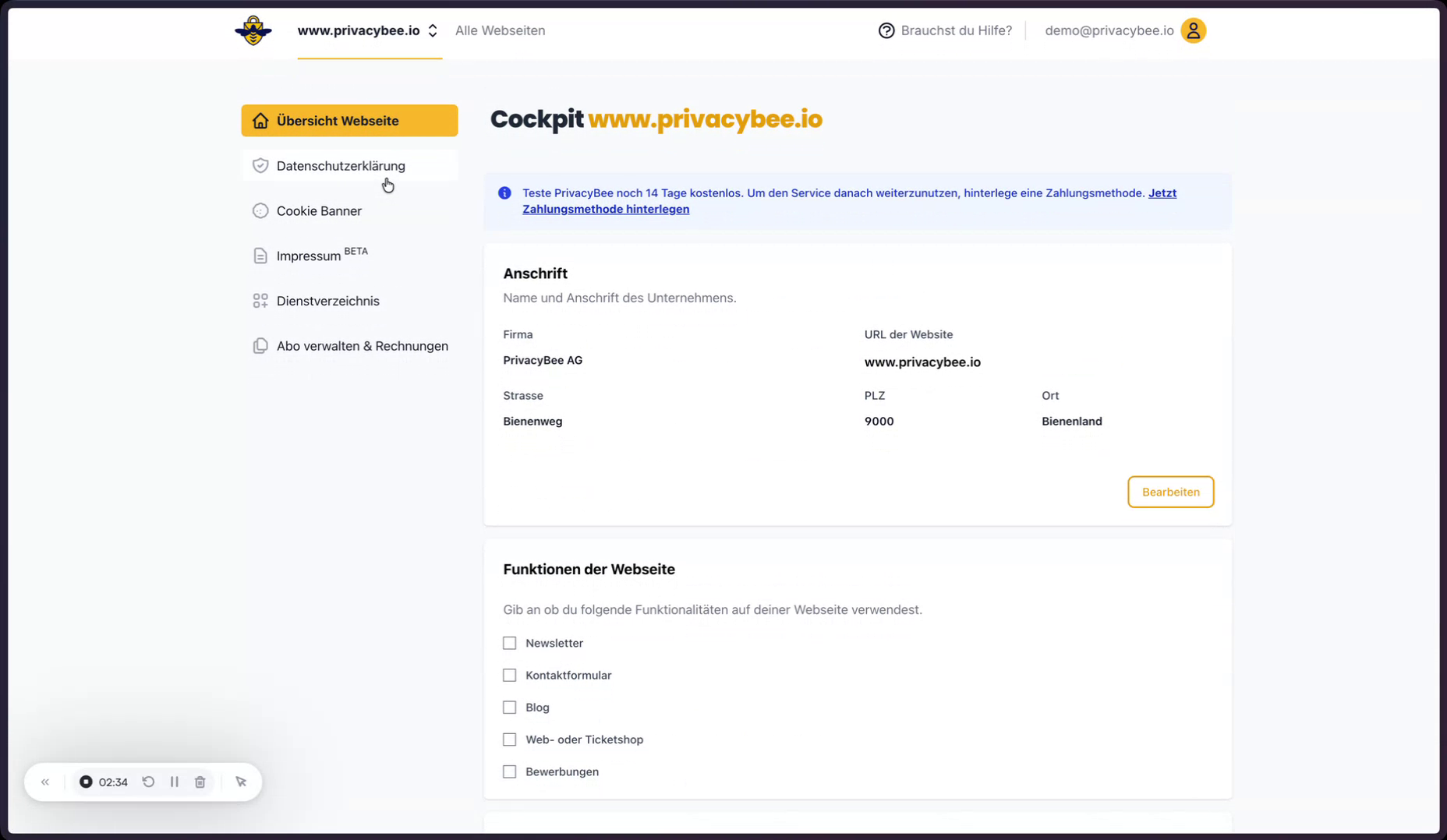 Um mit PrivacyBee zu starten, wird zunächst die kostenlose Testphase aktiviert. Dafür wird die eigene Domain sowie eine E‑Mail-Adresse eingetragen und die erforderlichen Basisdaten ergänzt. Anschließend scannt Privacybee die Webseite und erkennt automatisch alle datenschutzrelevanten Dienste.