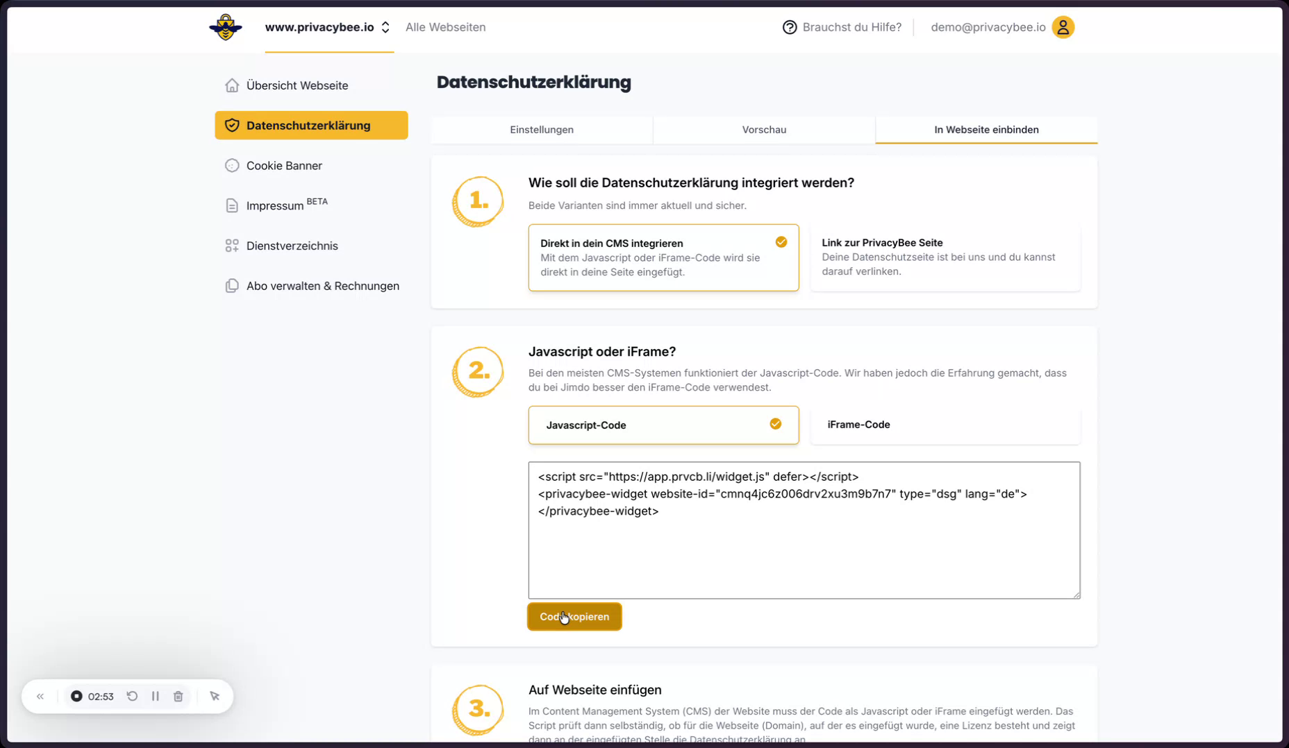 Anschließend wird das Impressum in die zuvor erstellte Impressums-Seite eingebunden. Dazu wird in PrivacyBee der Einbindungscode kopiert.