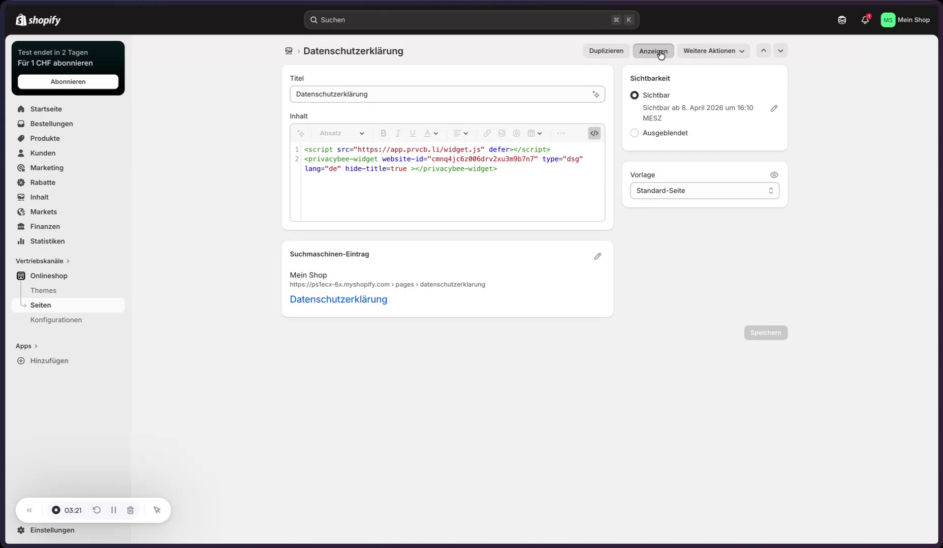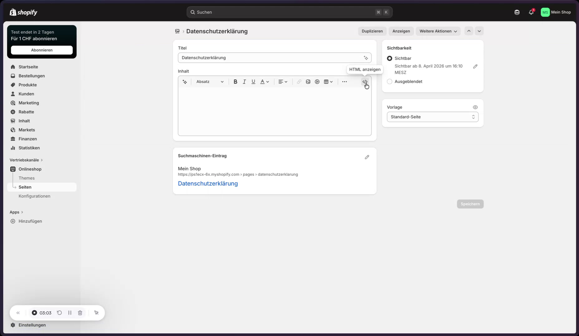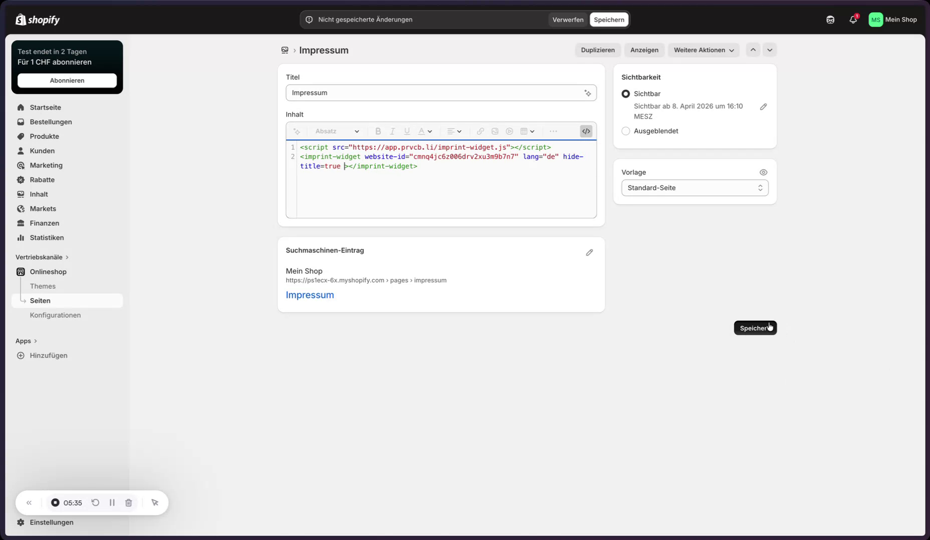 Im Shopify-Admin wird unter „Onlineshop“ → „Seiten“ die Impressums-Seite geöffnet, wieder in den HTML-Modus gewechselt, der Code eingefügt und gespeichert.