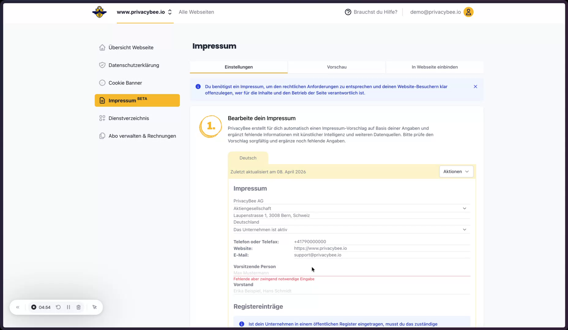 Nun wird das Impressum in PrivacyBee erstellt. Dabei werden insbesondere die Sprache sowie das rechtlich relevante Land festgelegt.