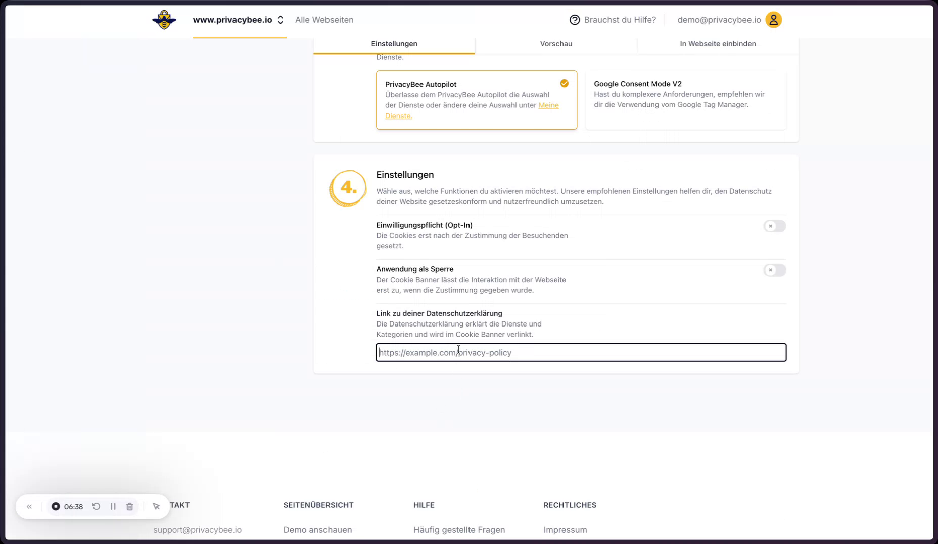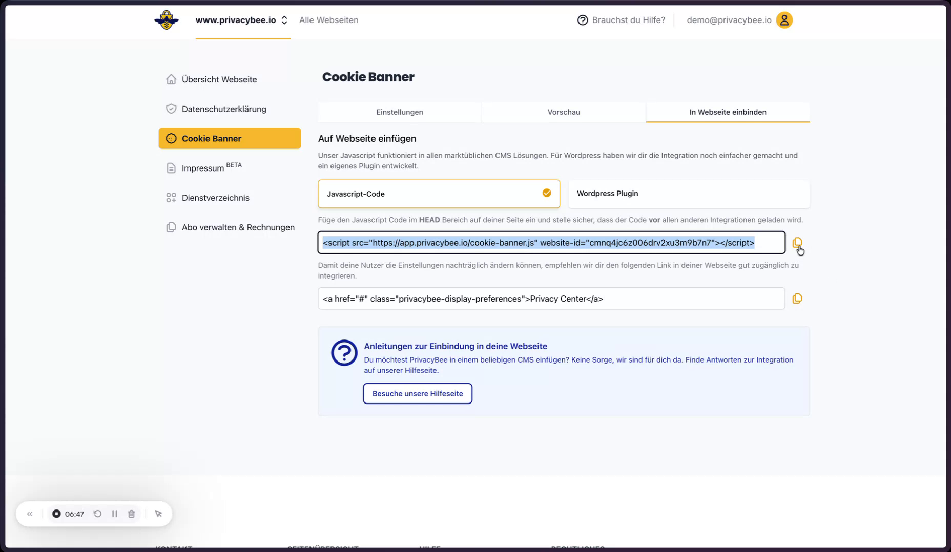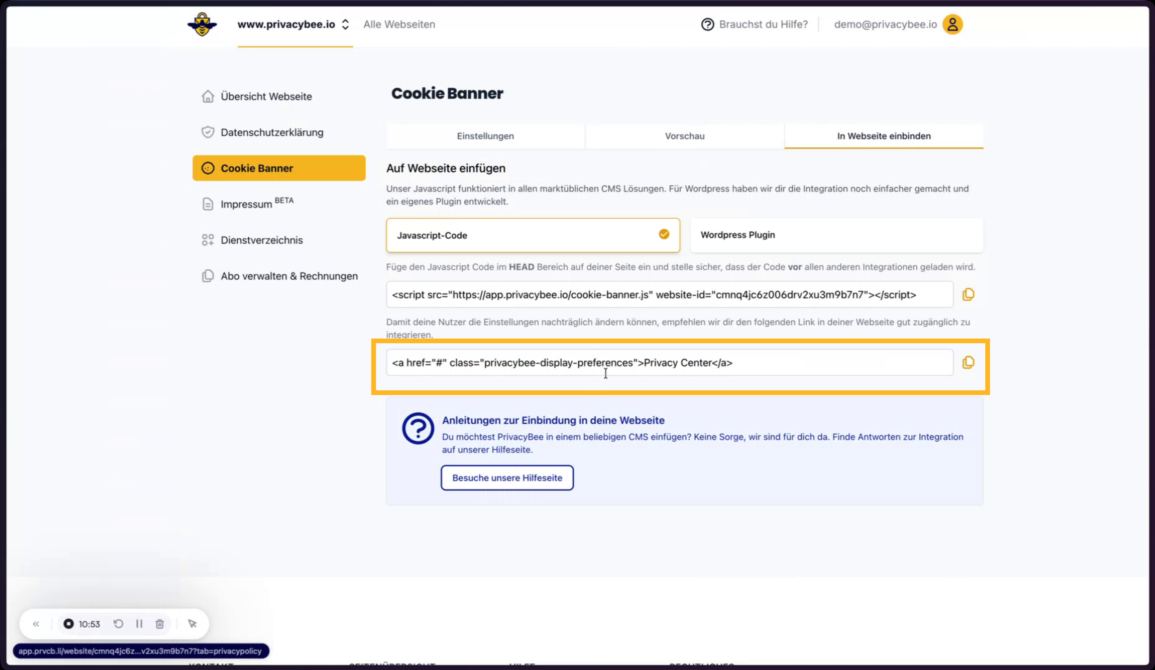 Dieser Link wird anschließend in den Cookie-Banner-Einstellungen von PrivacyBee eingefügt. Danach kann die Vorschau des Cookie-Banners geprüft und der Einbindungscode für die Webseite generiert werden.