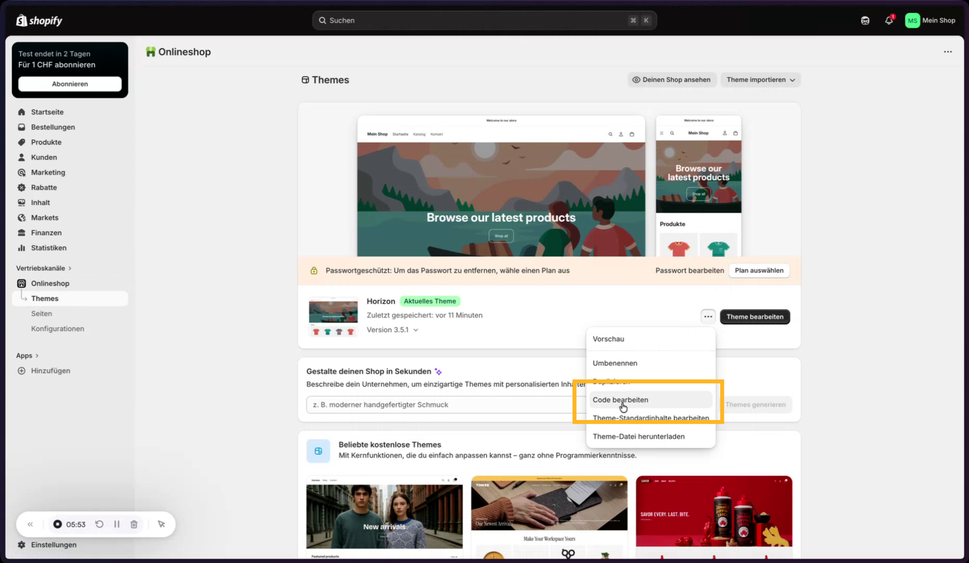 Im Shopify-Admin wird unter „Onlineshop“ → „Themes“ die Option „Code bearbeiten“ gewählt. Im Theme-Code (z. B. in der `theme.liquid`) wird der Cookie-Banner-Code vor allen anderen Skripten in eine neue Zeile eingefügt und gespeichert.