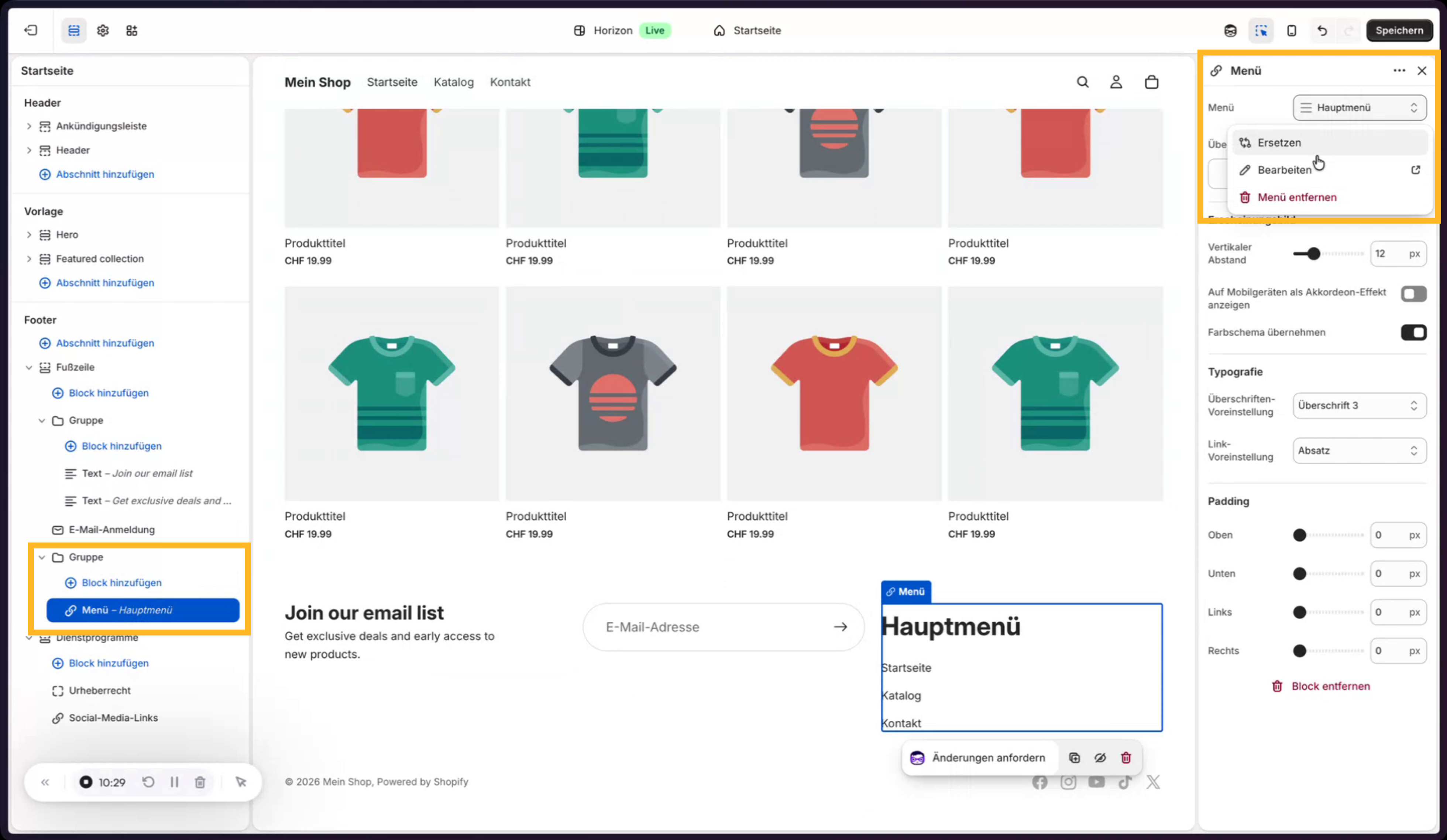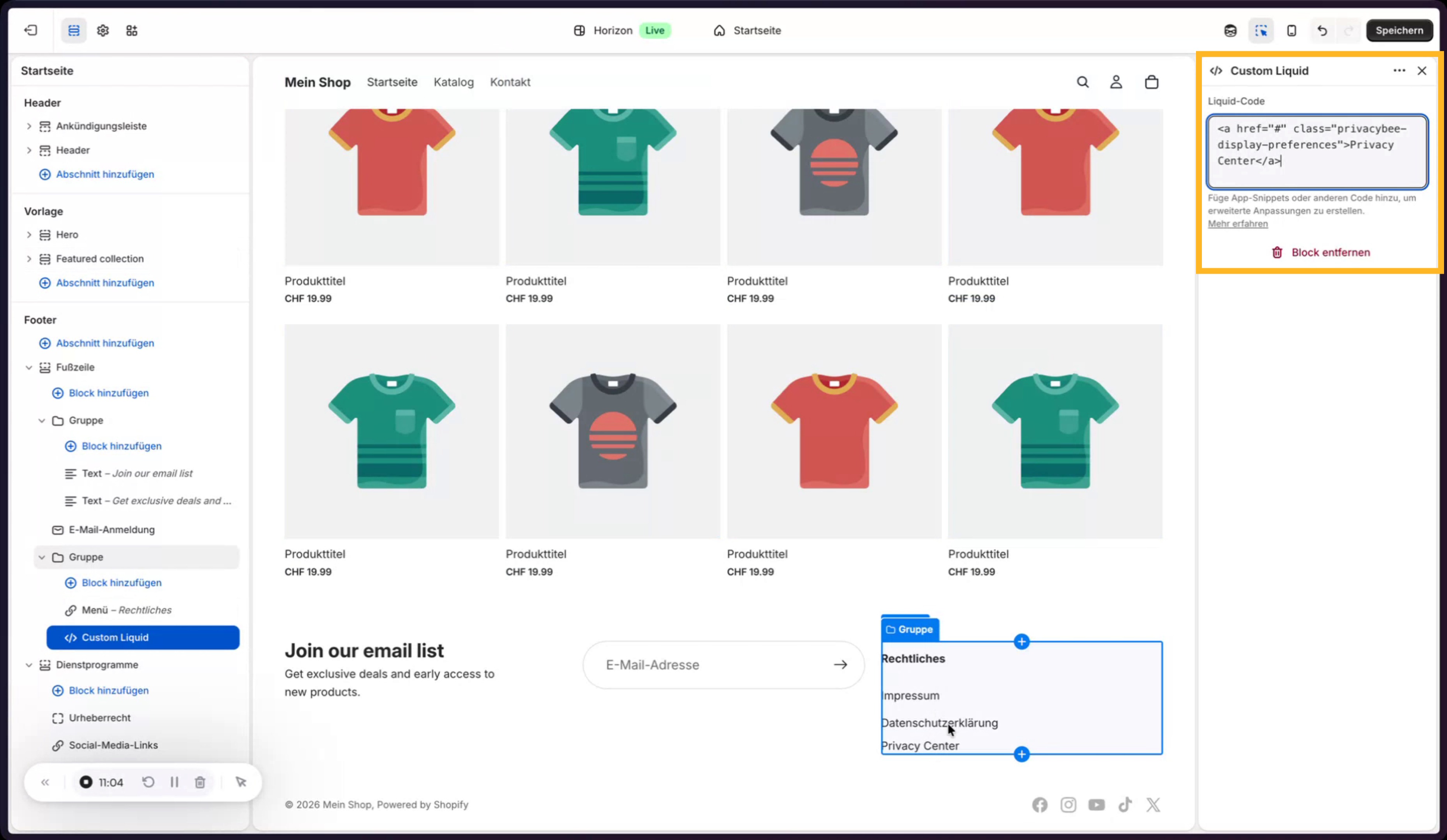 Nun werden die rechtlich relevanten Links im sichtbaren Bereich des Shops (z. B. im Footer) platziert. Dazu wird im Theme-Editor eine neue Gruppe bzw. Sektion erstellt oder eine bestehende dupliziert. Nicht benötigte Textelemente werden entfernt, und stattdessen wird ein Menü-Block eingefügt, in dem das zuvor erstellte Menü „Rechtliches“ ausgewählt wird. Die E‑Mail-Adresse wird an eine passende Stelle verschoben, der Titel der Gruppe wird passend formatiert.